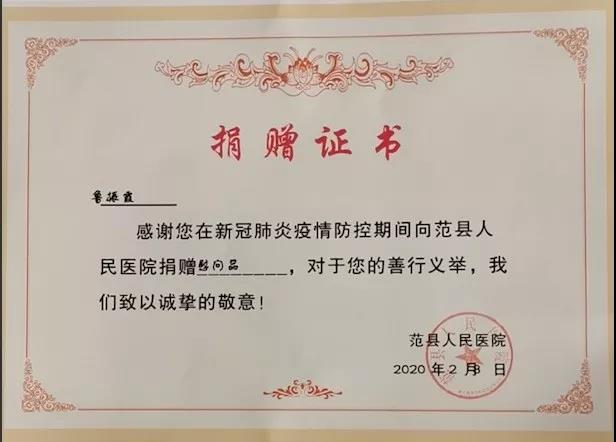 濮范台分公司总经理鲁振霞分别向范县王楼镇、范县人民医院捐赠价值5000元的消毒用品和2000元的慰问品。