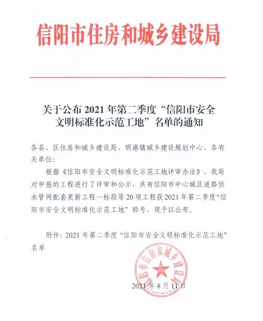 近日,信阳市住房和城乡建设局公布了2021年第二季度“信阳市安全文明标准化示范工地”名单。