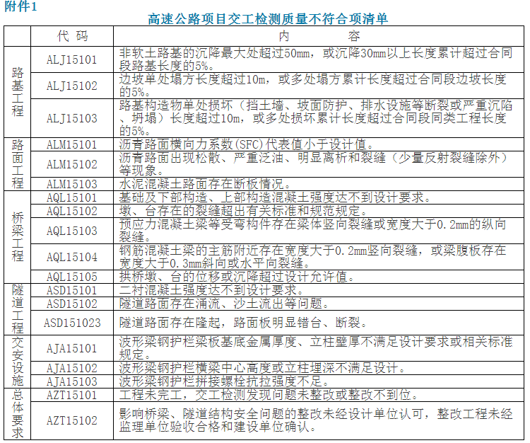 高速路交竣工检测和鉴定质量不符合项清单元月1日启用