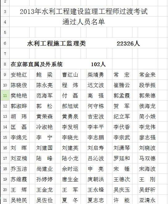 2013年水利工程建设监理工程师过渡考试通过人员名单